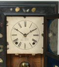Stenciled case w/mother-of-pearl inlay (some loss to mop) In original finish, original sgn painted metal dial. Original reverse painted tablets. Lower picture of J.C. Brown. 8 day t/s brass spring driven movement. Good label.