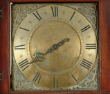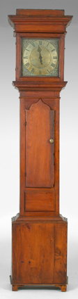 Pine case in old patina. Sgn. engraved brass dial w/applied spandrels. 30 hr t/s brass weight driven movement w/ 1 hand.