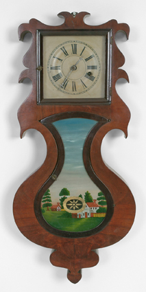 J.C. Brown Wall Acorn Clock - Mahogany case, old patina, old tablet, repainted metal dial, 8 day time only brass spring driven movement. 24 ½”