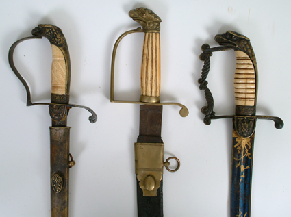 30" blade, blue & gilt panels (worn). Brass fittings. Spread wing eagle on langlet. P-guard, eagle head pommel. Quillon has been broken off & poorly restored. Original carved bone grip. Original brass scabbard. Similar to Medicus collection-plate 46B.