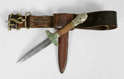 Horn Handled Dirk- Original leather belt & sheath, "LIBERTY & UNION" on crossguard. Double headed buckle. 8 3/4" overall.