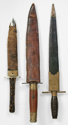 Side Knife w/Turned Wood Handle- Brass crossguard, leather sheath. 14 3/8" overall. Wooden Handle Knife- Steel crossguard, leather sheath, brass furrels. Blade pitted, battlefield pick-up. Wood Handle Side Knife- Steel crossguard. 20 1/4" overall.