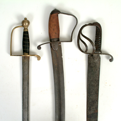 Hand forged blade 23.5" x 1.875" wide at hilt, slight curve, slight taper to point, flat, no fullers. Mated w/early iron cavalry style hilt, w/langlets. Remnants of ribbed wooden grip, blade tang exposed. No scabbard.