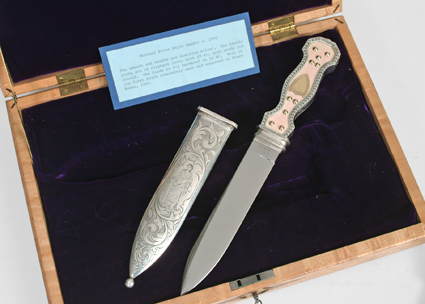 Bruce Beebe Copy of a California Knife- Custom handmade copy of an M. Price CA knife. Ivory handles w/silver & gold decoration. Custom made box.