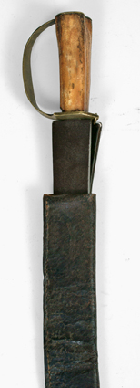 Hand forged blade, unique 24 .25" blade, slightly curved, 1/75" wide x .300" thick at the hilt. Top flat of blade marked "M". Heavy brass D-guard bow, flat brass pommel shaped to match heavy bone grip. Top of guard pierced w/small brass ring. Original leather scabbard w/ single heavy belt loop.