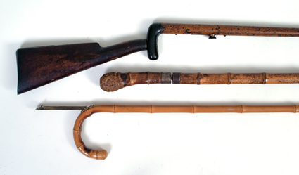 Cane Gun- Screw off stock, Screw off tip reveals rod. Sword Cane- Bamboo Measuring Cane- Bamboo cane w/silver thumb medallion. Sterling mark. JH marked. (hands for horses)