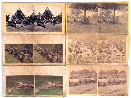 Group of 6 Gardner & Anthony Civil War Stereoviews- Camp life on the Potomac, Wounded Indians, Battle of Antietam Dead, Gibson's Horse Artillery, Gen. McClellan's Hdqtrs, Irish Brigade dead at Antietam.