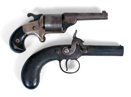 Moore's Patent Front-Loading Revolver- Type 1, engraved frame. Some silver plating remains. British Percussion Pocket Pistol- Single shot, .50 caliber, side hammer, screw-off bbl. Marked "Gameson & Co. London", bag grip w/silver escutcheon.