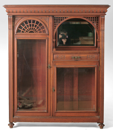 Cherry, original finish. Mirror back & fretword ornamentation, 2 door.