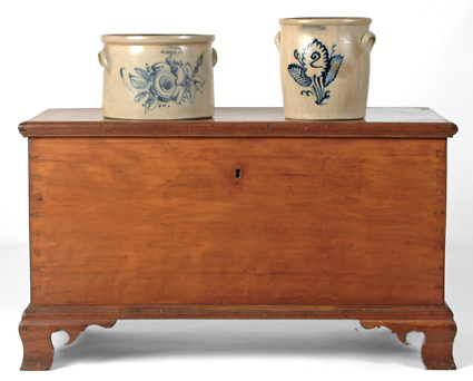 18th C. Blanket Chest- Ogee bracket feet, Dovetailed cherry in old patina Haxtun & Co. 4 Gal. Crock- Fort Edward NY, old repairs John Burger 2 Gal Crock- Rochester, NY