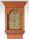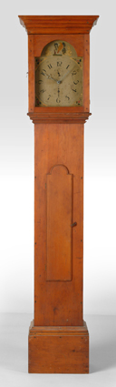Pine Tall Case Clock- Old patina, painted wood dial, woodworks w/weight driven movement, alarm,second bit hand & calendar.
