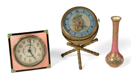 2 Enameled Clocks-New Haven Clock Guilloche, minor loss to black, & Swiss marked Didisheim-Goldschmidt miniature clock, metal dore. Satsuma Vase-Miniature vase w/gilded decoration & Geisha