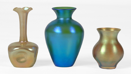 Sgn. Steuben Aurene Bud Vase- Pinched sides, sgn Aurene 165 Blue Quezal Vase- Sgn. on base Steuben Aurene Vase- unsigned