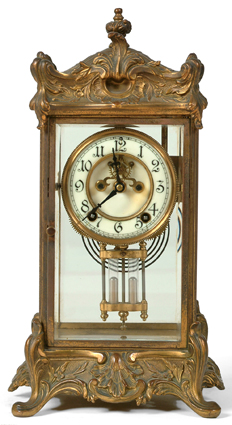 Crystal Regulator Clock- Porcelain dial, open escapement, brass case. Hairlines in dial at winding arbors & s/fhole. Broken tube in mercury style pendulum.