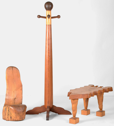 Stump Chair "John Brooks"- carved from stump Coat Rack- Cherry, maple, rosewood and walnut. Original finish & condition Oak Coffee Table- Original finish & condition