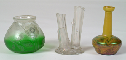 Acid Cut Back Vase- Clear to green, unsigned Steuben Stump Vase- Unsigned Art Glass Vase- Gold, iridescent swirl