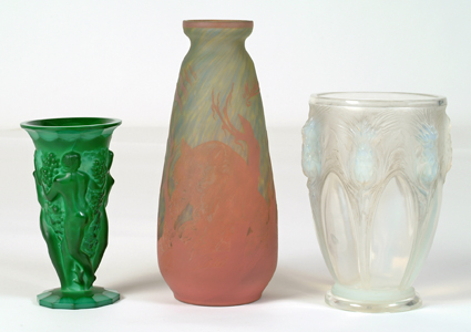 Malachite Vase- Nudes, grapes, sgn. Desna Bohemia Sgn. Madelaine Cameo Vase- Bear in tree Sabino Type Vase- Thistle pattern
