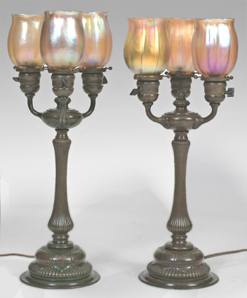 2 Tiffany 3-Light Table Lamps Bronze bases marked Tiffany Studios #310, 4 shades sgn. L.C.T. minor fitter rim chips, original deep brown patina