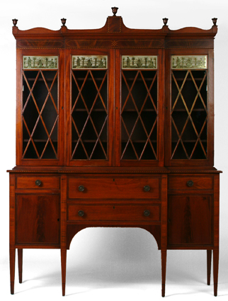 Hepplewhite Style Mahogany Breakfront Bench Made, String Inlay, Reverse-Painted Glass w/ Classical Figures