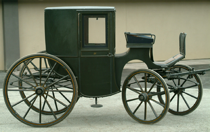 Healey & Co. NY Horse Drawn Coach Original paint, upholstery. Stenciled wheels, owned by Hiram Sibley of Rochester, NY, Provenance: Strong National Museum of Play Ht. 6'3" L 10' 10" W 5'2"