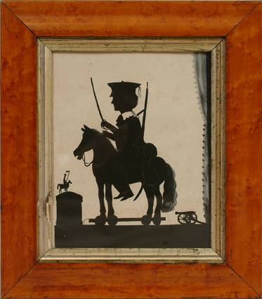Early 19th C. Silhouette Boy on Hobby Horse Appears to retain original frame, sword, gun &military hat, "Ride a cock horse to Banbury Cross to see a fair lady on a white horse" on back.