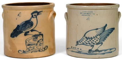 L- New York Stoneware Co. 4 Gallon Crock - Fort Edward NY, bird on stump decoration, some staining R- Chicken Pecking Corn 4 Gallon Crock - Some rim chips, spiderline cracks & discoloration