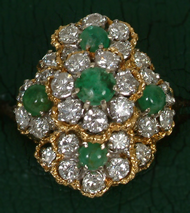 Collage flower ring w/rope borders containing 5 cabochon emeralds measuring 4.50mm to 5.50mm. The emeralds weigh 0.30 carats each to 0.35 carats each. 1 emerald contains a chip. There are 7 round brilliant diamonds measuring 3.40mm each & weighing approx. 0.15 carats each or 1.05 carat total. There are 26 round brilliant diamonds measuring 3.10mm each & weighing approx. 0.11 carats each or 2.86 carats total. The total diamond weight is .391 carats. Clarity range from SI2-Il. The color range is F-G-H.