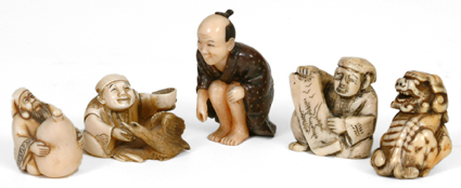 L- Carved Ivory Man - With gourd, sgn. LM- Carved Ivory Man - Feeding ducks,sgn. M- Carved Ivory Man - Fishing okimono RM- Carved Ivory Man - With scroll R- Carved Ivory Shisi - On ball