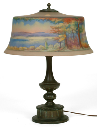 Pairpoint Reverse Painted Table Lamp - Lake scene w/trees, shade sgn. Pairpoint Corp. patinated base impressed sgn. & paper label