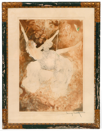 Girl in swing, copyright 1928 Louis Icart- Paris, paint loss to frame