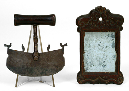 L- Iron & Wood Food Chopper - Hand hammered, birds & stylized design, original patina R- Carved & Painted Miniature Mirror - Late 18th or early 19th C. Original paint & condition