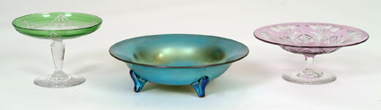 L&R-Steuben Green Compote & Amethyst/Clear Compote - L- threaded, unsigned, R- etched, fleur de lis mark M-Steuben Blue Aurene Footed Bowl - Sgn. Aurene #2696