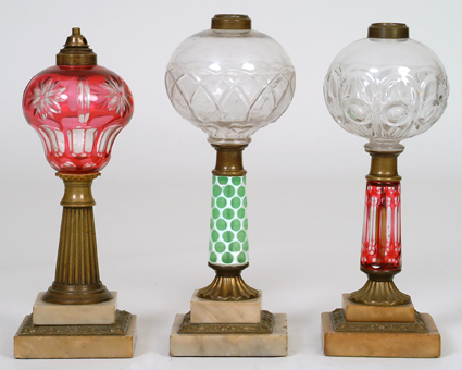 L- Cranberry Overlay Oil Lamp - Marble base, brass fluted column M- White Overlay on Green Oil Lamp - Marble base, chip in overlay, gothic heart clear font R- Cranberry Overlay w/Clear Top Oil Lamp - Marble base w/brass