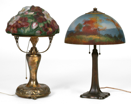 L- Pairpoint Puffy Rose Lamp - Cracks to shade along rim R- Handel Reverse Painted Lamp - Autumn scene, shade sgn. Handel 7147 Walter, base patinated metal, sgn. Handel- impressed & cloth label
