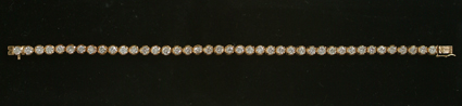 Set in yellow gold four prong basket style mounting stamped 14K. Figure 8 safety catch attached to box style clasp. There are 41 round brilliant cut diamonds, measuring 2.80mm to 3.00 mm each with total wt. approx. 3.50 ct. Clarity range is SI-2to I-1. Color range is I-J (GIA)