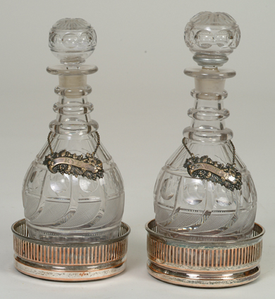 2 Similar Blown & Cut Glass Bottles - Rye & Scotch tags, on Sheffield Plate mahogany casters, minor chips to stoppers