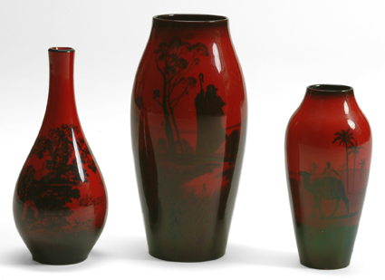 L- Royal Doulton Flambe Woodcut Vase - #1612 M- Royal Doulton Flambe Vase - Shepard scene R- Royal Doulton Flambe Vase - Camel /Desert scene