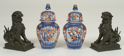 L & R- Pr Bronze Oriental Dogs - Original patina & condition Pr. Oriental Imari Covered Jars - Ribbed, underglaze blue w/polychrome decoration
