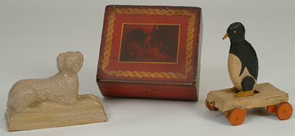 L- Molded Stoneware Dog - Original condition M- Stenciled & Painted School Box - Girl w/dog R- Penguin Pull Toy - Original paint & condition
