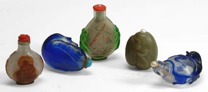 Group of 5 Snuff Bottles - L- Double overlay Buddha, LM- overlay swan, M- overlay fish, RM- Carved hardstone melon R- Overlay tortoise