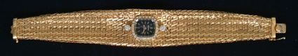 Ladies Bulova watch stamped 14-karat. 2 round brilliant diamonds measuring 3.40mm each & weighing approx. 0.15 carats each or 0.30 carats total. There are 26 single cut diamond set around the face measuring 1.00 mm each & weighing 0.13 carats total. Clarity ranges from VS-1 to SI-1. Color ranges from H-I-J. Provenance: Private Buffalo NY estate