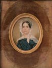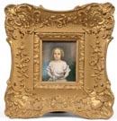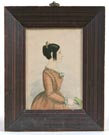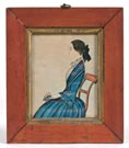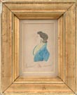 Lot #295: Watercolor of Young Lady Young lady in blue dress and bonnet. Original Condition - Frame. Some minor foxing. 4" x 3"