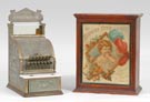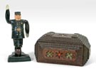 Lot #316 & 317: Cast Iron Police Officer Radiator Finial & Tramp Art Box - L: Original paint, 6". R: Original finish & patina, 6" x 10"