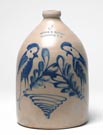 Lot #289: 3 Gallon Arther M. Eastman - Signed Arthur M. Eastman, Manchester NH. Stoneware jug with double, cobalt decorated parrots. Very good. 16"