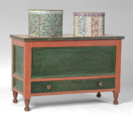 PA Red & Green one Drawer Blanket Chest - Original red & green paint. Hinges reset & knobs replaced. Ht. 29" W 43" D 19"