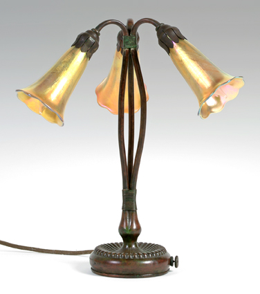 Tiffany 3-light Lily lamp - Stamped Tiffany Studios, NY, 319. Shades signed LCT. Original patina. Excellent original condition. 13"