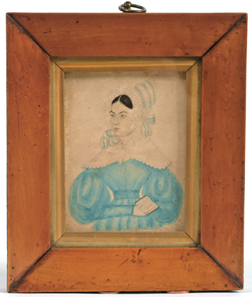 Young lady in blue dress and bonnet. Some minor foxing. 4" x 3"
