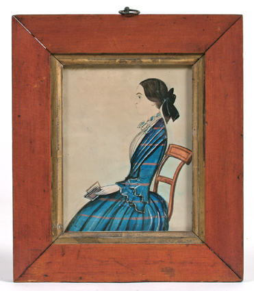 19th Cent. Watercolor- Young Lady in dark blue-dress seated in ochre side chair. Original Condition frame. Excellent Condition.