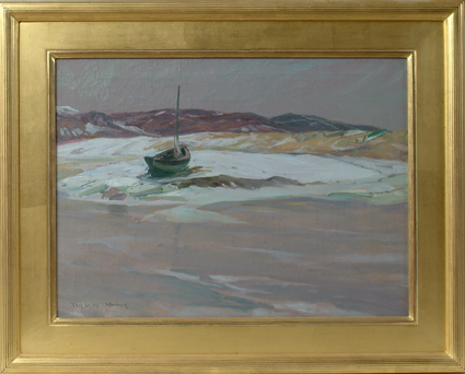 Charles Woodbury O/C (1864-1940, American) - "Boat Ashore" O/C Exhibited at Boston Museum of Fine Arts. Excellent original. 20" x 27"