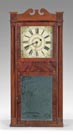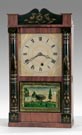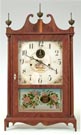 Lot #25 - (L) Rare William Hickcox Bridgewater, NY Shelf Clock Mahogany case w/original stenciled 1/2 columns, leaf & fruit crest in old patina. Outstanding original painted floral wood dial and period reverse painted tablet. 30 hour t/s, weight driven wood works movement. Nice clean label. Provenance: Robert Ewald. Ht. 29" Est. $1,000-1,500